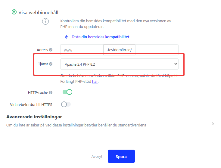 - Klicka sedan på ”Redigera” till höger och välj önskad PHP-version innan du klickar ”Spara”.