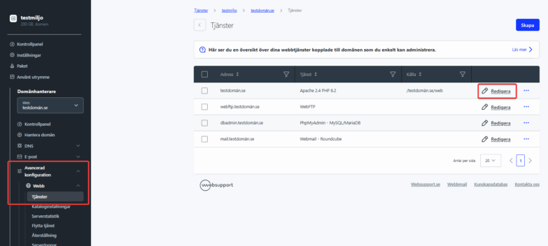 - I den mörkare menyn till vänster, gå till ”Avancerad konfiguration > Webb > (Tjänster)”, sedan på ”Redigera” till höger