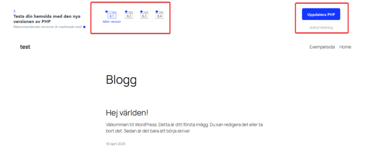- Ändra PHP-versionen via kontrollpanelen och kontrollera att allt fungerar korrekt på webbplatsen.