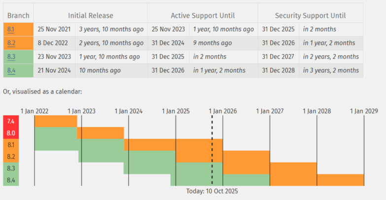 Livscykeln för PHP-versioner som stöds finns på PHPs egna hemsida: https://www.php.net/supported-versions.php