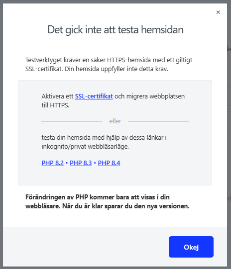 Om din sida inte har ett aktivt SSL-certifikat ser det lite annorlunda ut när du testar PHP-versionerna. Då möts du istället av denna ruta. Du kan fortfarande testa de olika versionerna, men du kan inte lika snabbt växla mellan dem. Och vi rekommenderar i det fallet att testa detta i ett incognito-/privat fönster då cookies används.
