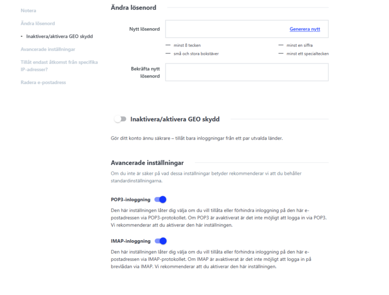 IP skydd– Ställ in så åtkomst till e-postadressen måste ske från specifik IP-adress.