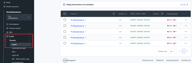 Om du istället vill administrera hela din e-postdomän eller bara få en tydlig översikt över dina olika e-postadresser klickar du istället på E-post -> Översikt> E-post i den vänstra menyn.