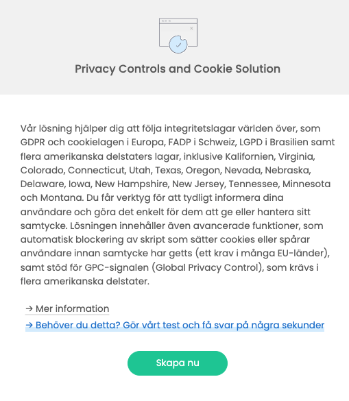 - Skapar både integritets- och cookiepolicy (läs mer om det här)