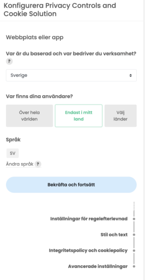 Först väljer du var din verksamhet och dina användare finns. Det avgör vilka regelverk som gäller. Välj ett av alternativen som finns eller lägg till länderna manuellt.