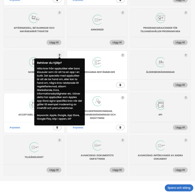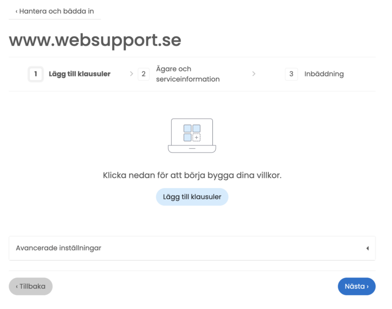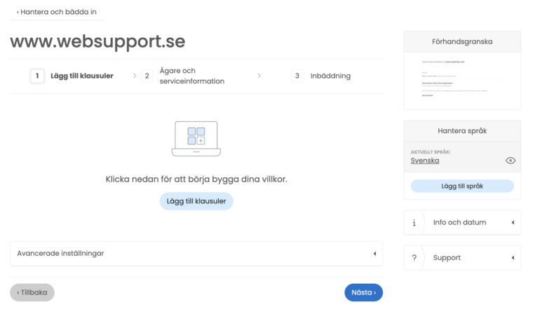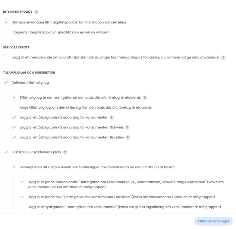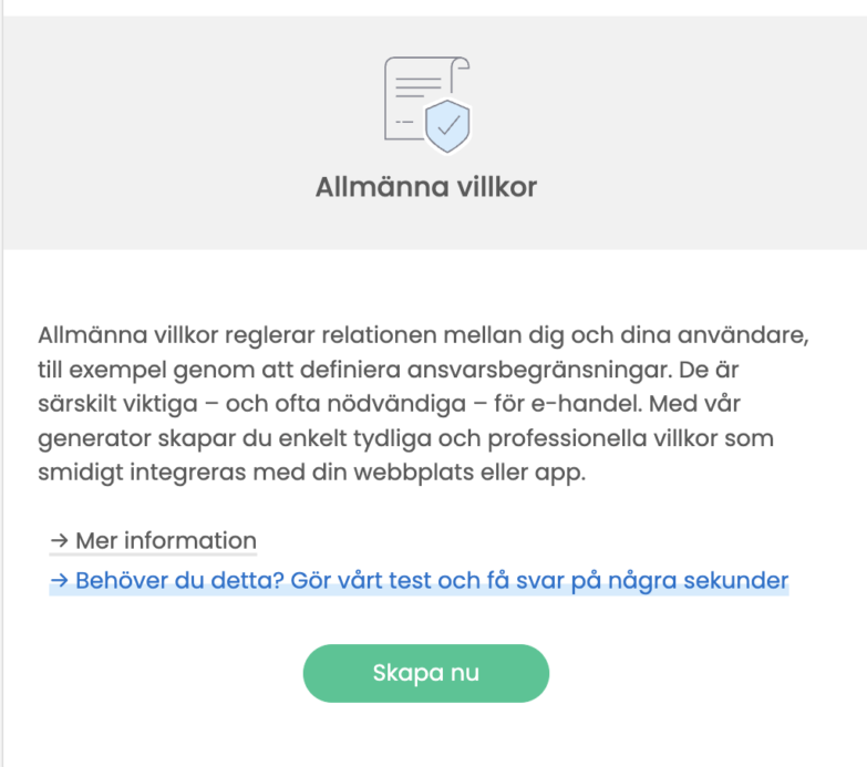 OBS! Eftersom användarvillkor är juridiskt bindande är det viktigt att de speglar din verksamhet korrekt. Vi visar hur du löser detta i nästa steg.