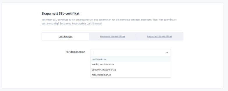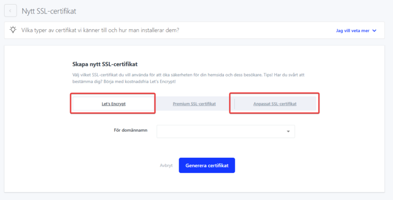 5. Välj om det är ditt eget certifikat (köpt från ett annat företag) eller Let’s Encrypt.