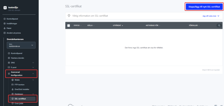 - Till vänster under ”Avancerad konfiguration” finns avsnittet ”SSL-certifikat.”