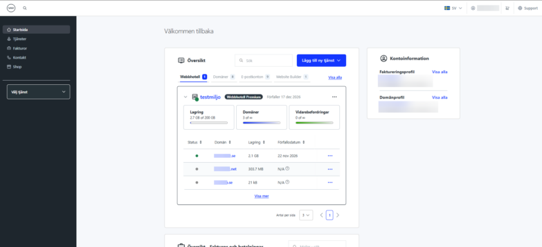 Kontrollpanelen är en intuitiv kontrollpanel där du framöver kommer administrera dina tjänster. Tack vare det användarvänliga UX-gränssnittet kan du enkelt hantera dina tjänster. För att komma åt kontrollpanelen behöver du ha en tjänst hos oss.