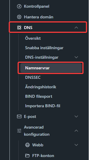 3. I menyn till vänster väljer du DNS och klickar på Namnservrar.