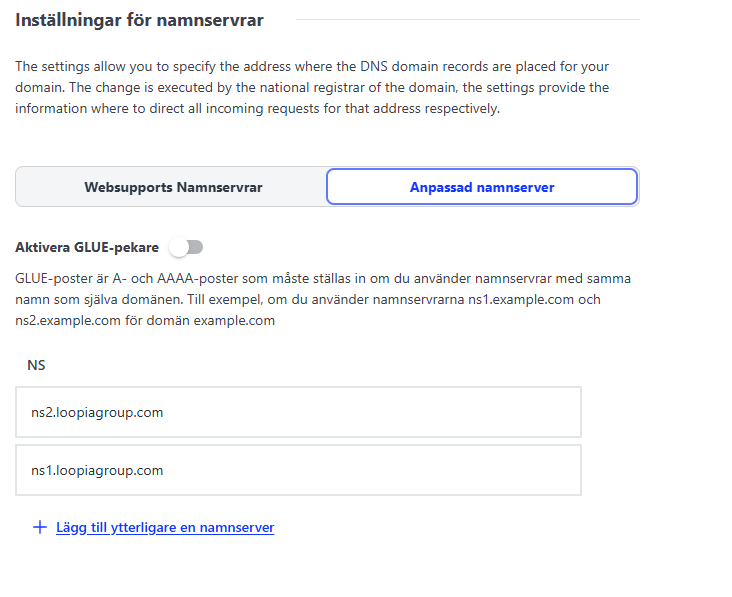 För att använda WebSupports namnservrar så anger du posterna ns1.loopiagroup.com och ns2.loopiagroup.com. Om du inte vill använda WebSupport för att hantera DNS-inställningar för din domän så väljer du alternativet Använd anpassade DNS-servrar och sedan kan du ange anpassade DNS-serveradresser i NS1-NS6.
