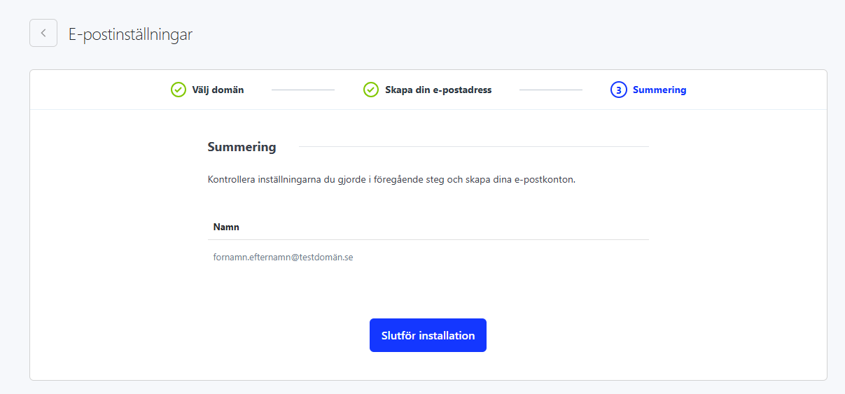 - I nästa steg visas en sammanfattning på vilken/vilka adresser som är på väg att skapas. När du sedan klickar ”Slutför installation” skapas adresserna.