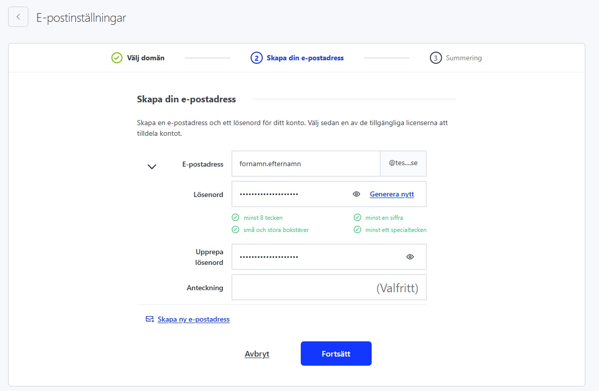 - Fyll sedan i vilken adress som ska skapas. Vill du exempelvis skapa ”info@domän.se” fyller du i ”info” i fältet ”E-postadress”. Klicka sedan ”Fortsätt”