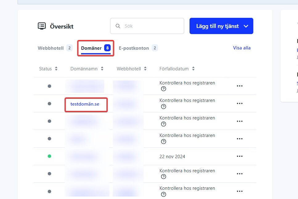 - Klicka på redigera till höger om huvuddomänen (Ser du ingen tjänst där klickar du på den blå knappen ”Lägg till tjänst” uppe till höger)